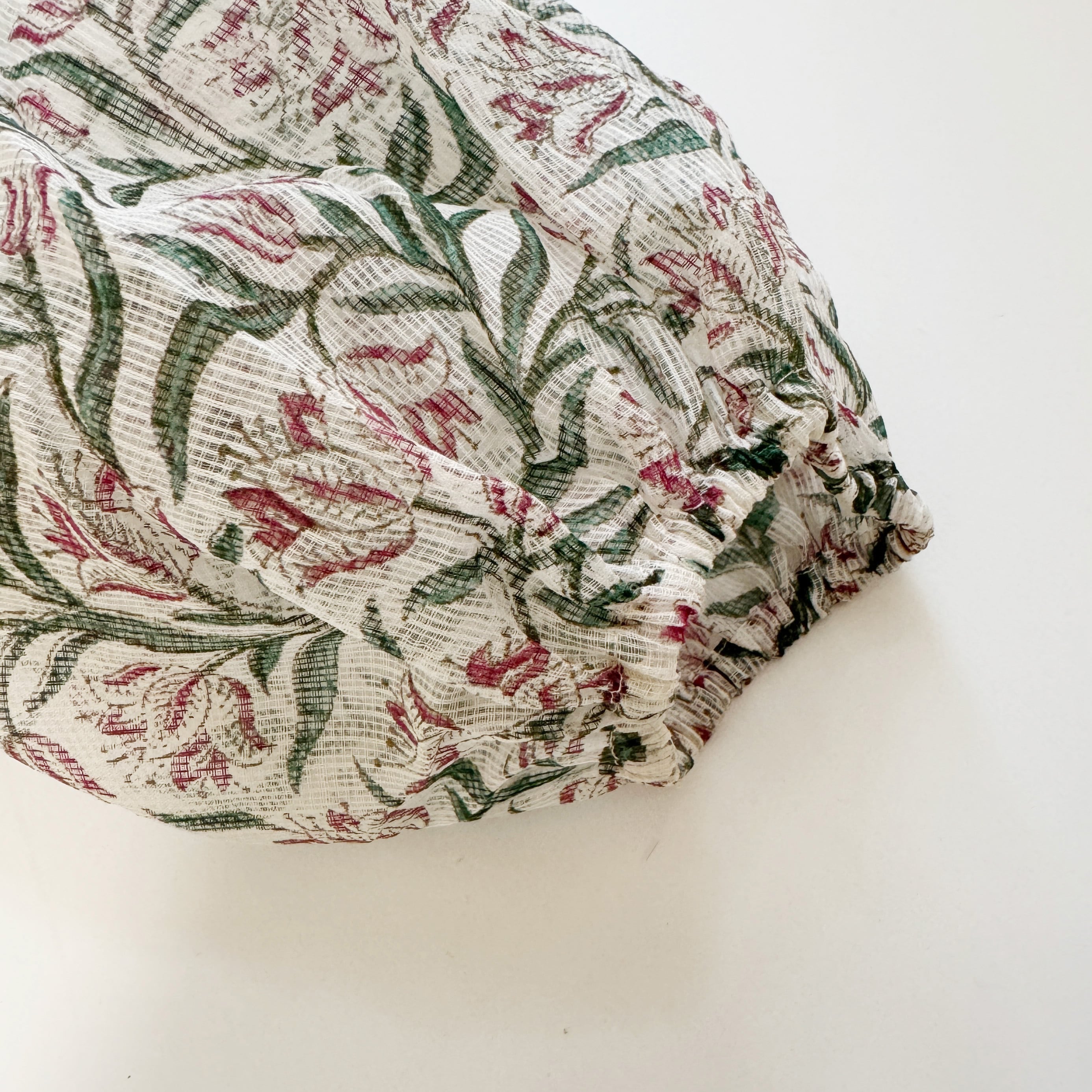 たおやかに咲くチューリップの総柄を木版プリントで施しています。この透け感のある美しい特別な布はインドでは「コタ」と呼ばれています。「コタ」はよく見ると、糸が密な部分と疎な部分がキューブ状に交互に織られているのが特徴で、薄手にも関わらず、丈夫でハリを失わず、ふんわりとまとうことのできる、インドの高級なサリー向けに織られてきた夏の布です。日本でいえば、和服の絽のような布と言えます。
