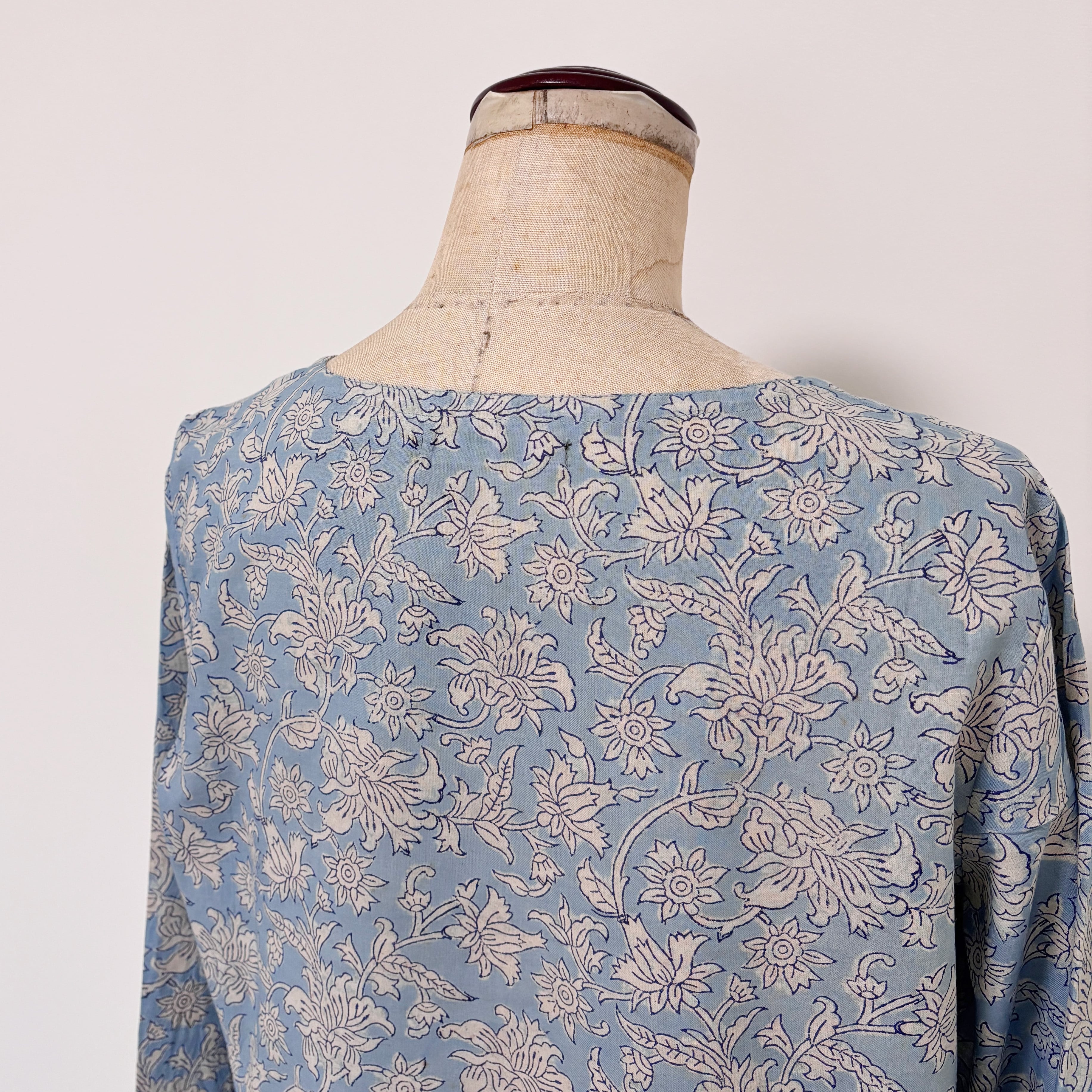 薄藍に染めたブロックプリント、ボタニカル柄のショートチュニックです。