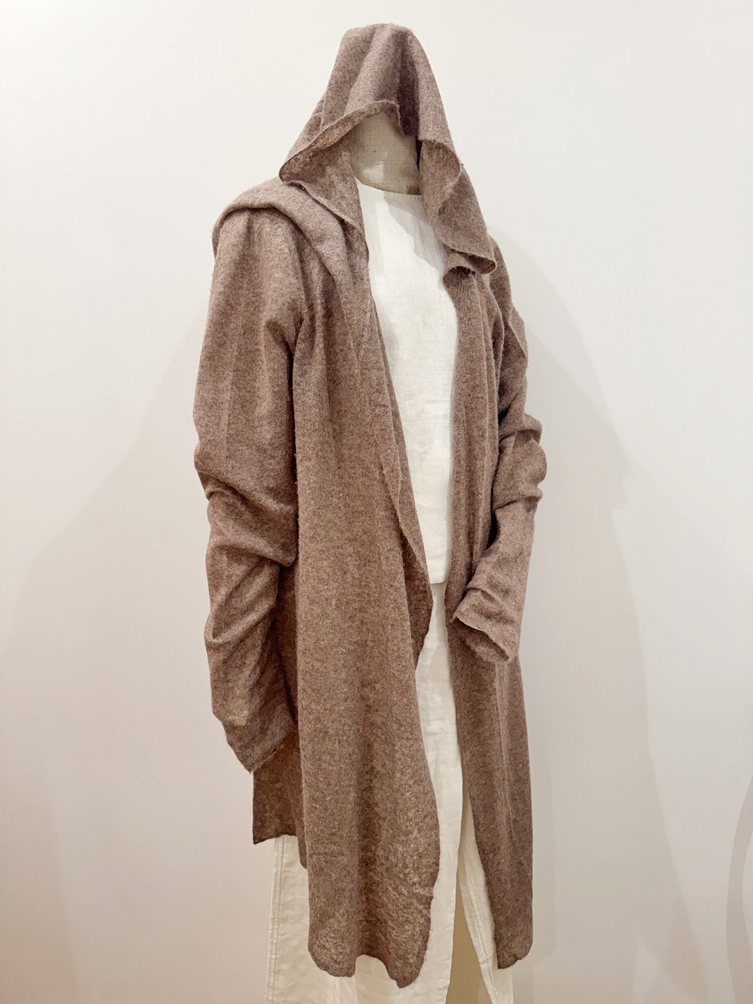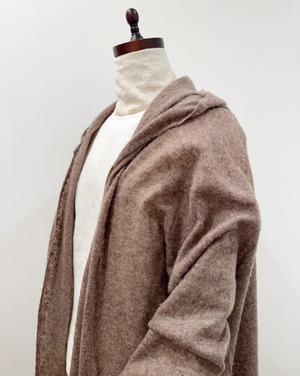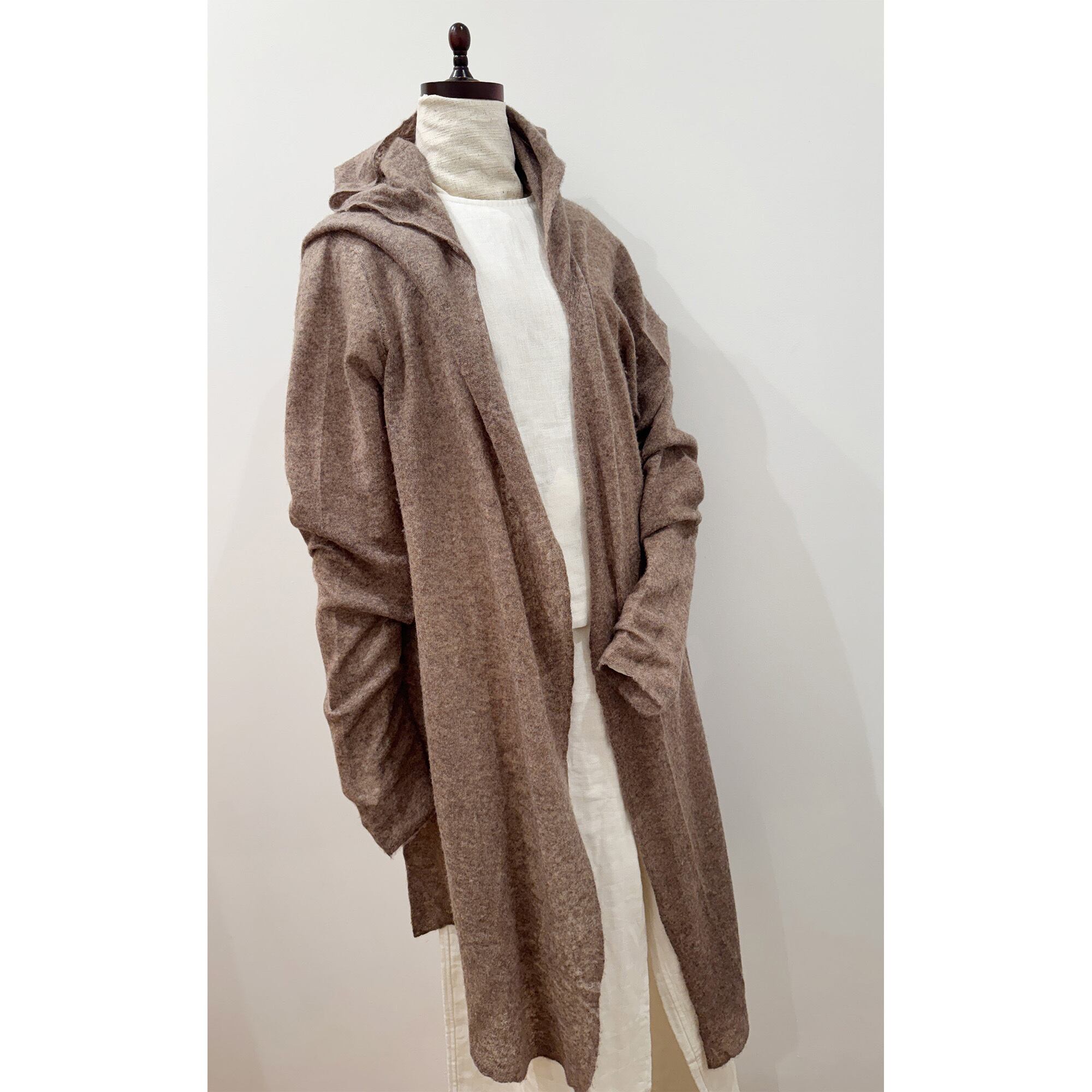 ニッティングをしたのちに少し摩擦を加えて、半フェルト処理をしているため、薄手なのに身につけるととても温かく、コートの下に一枚足したい時に重宝します。北風の日にはニットをかぶると可愛くチャーミング。