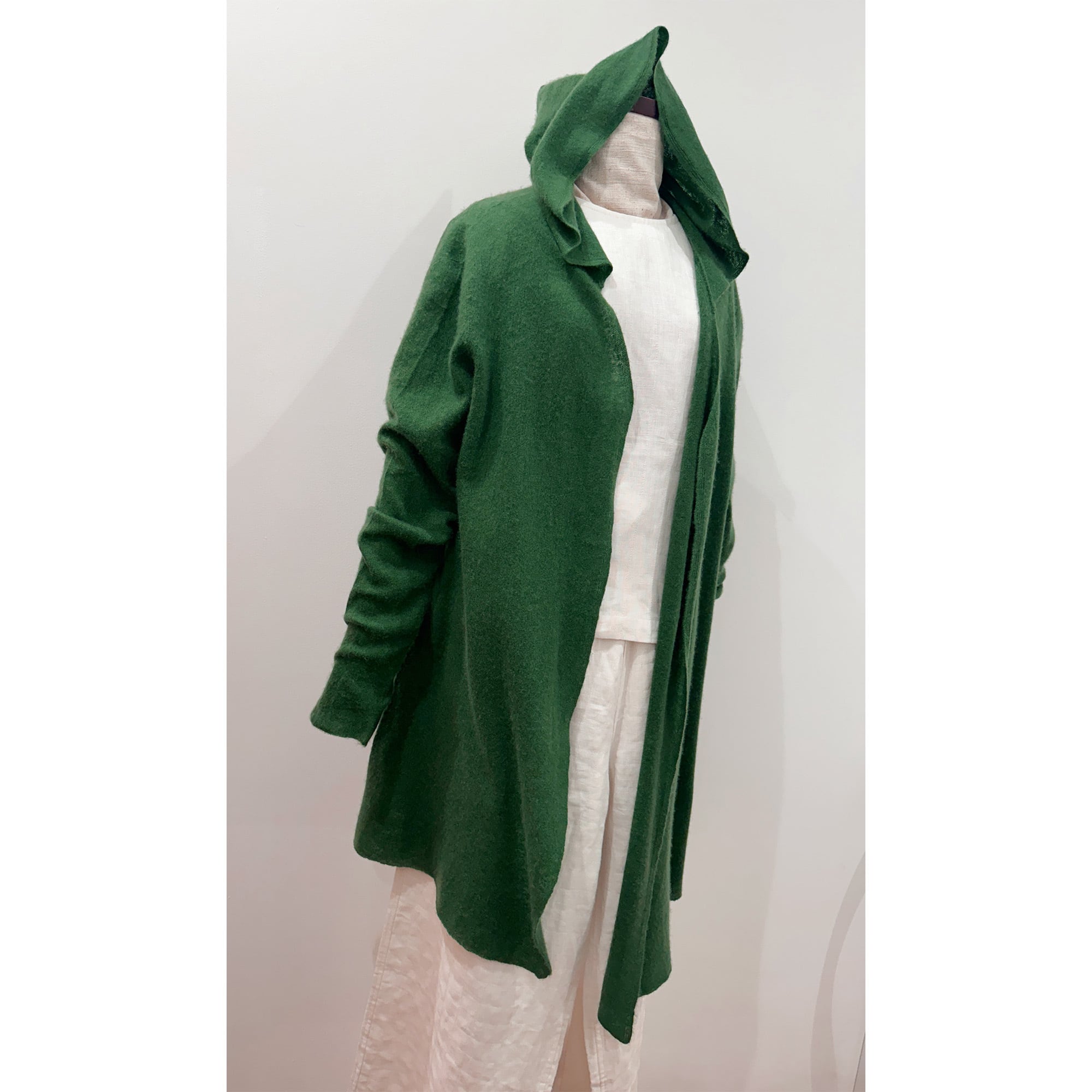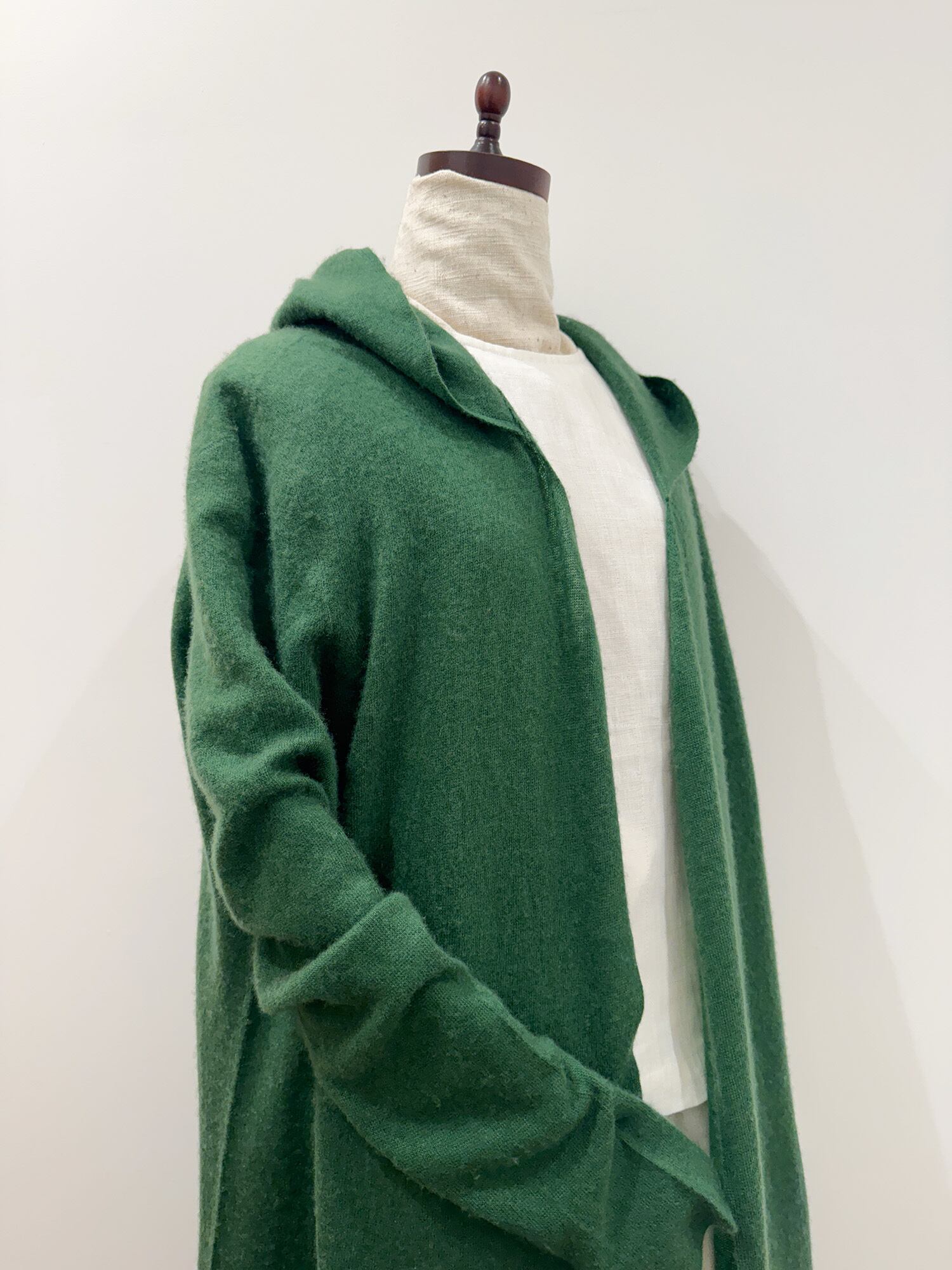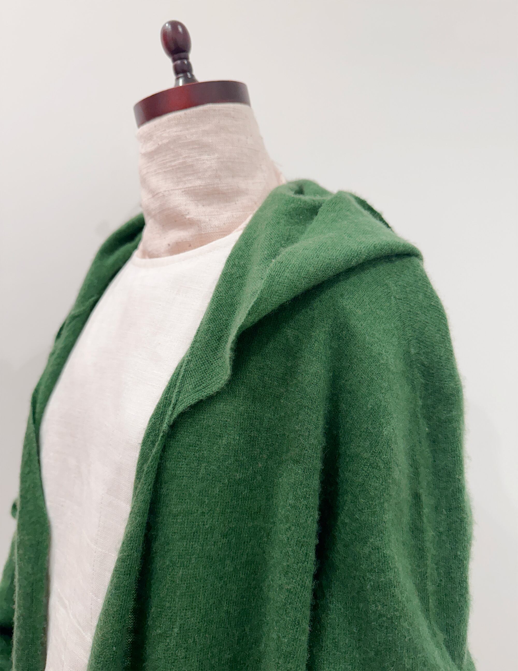 驚くほど軽やかなカシミヤ100%のフード付きカーディガン。