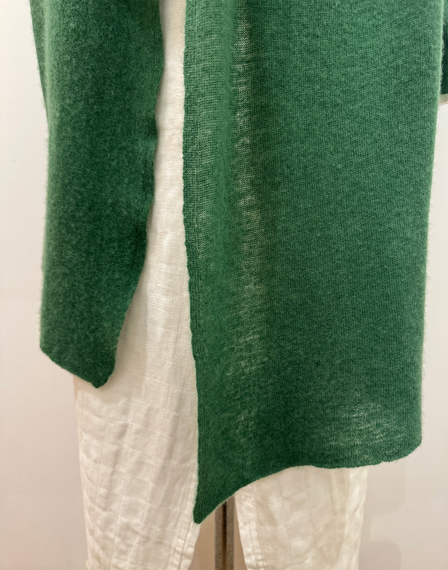 また、前見ごろの左右の長さを変えて、エアリーなニュアンスを強調しています。前を合わせて、ベルトなどで閉じて着ても素敵です。