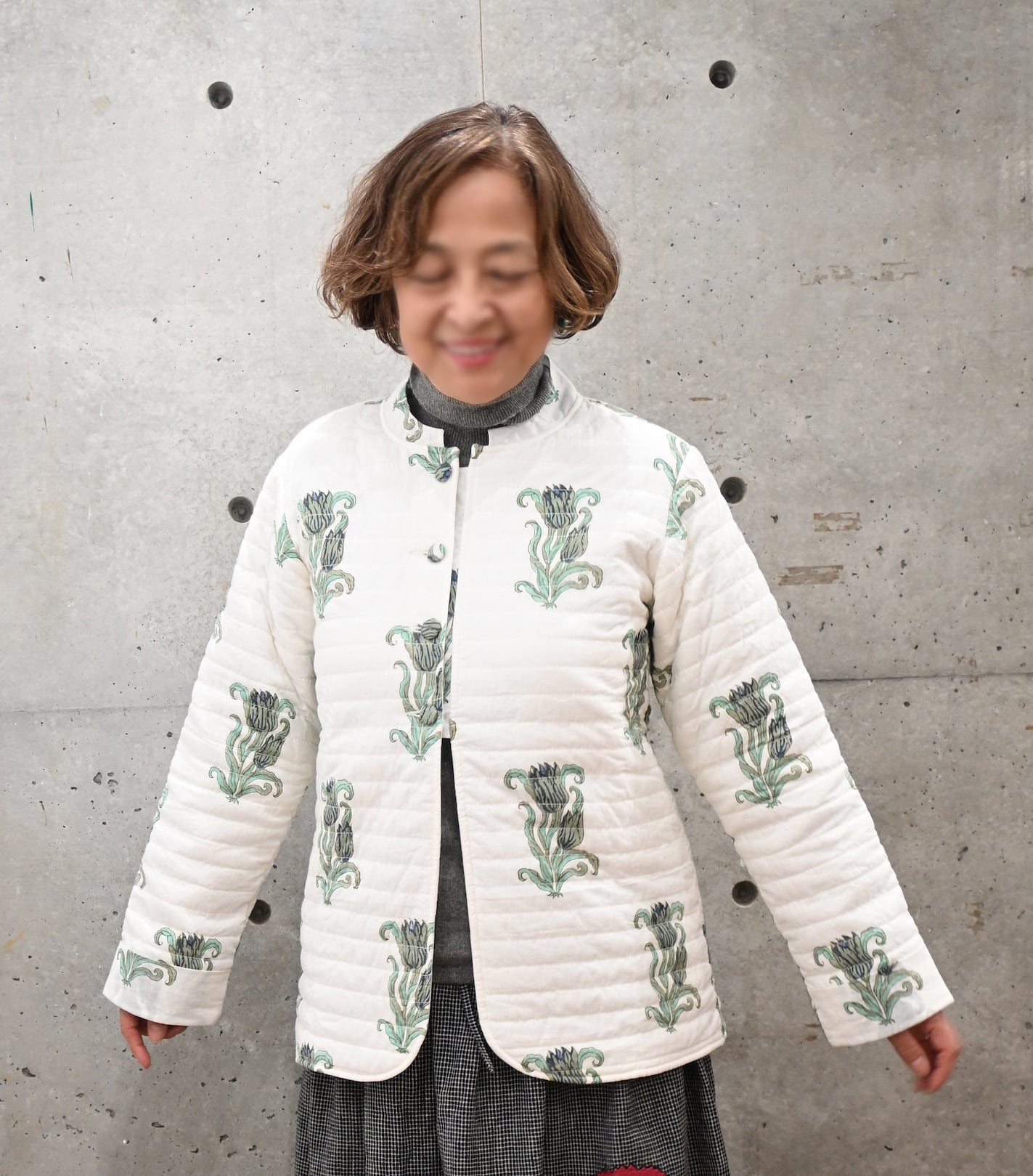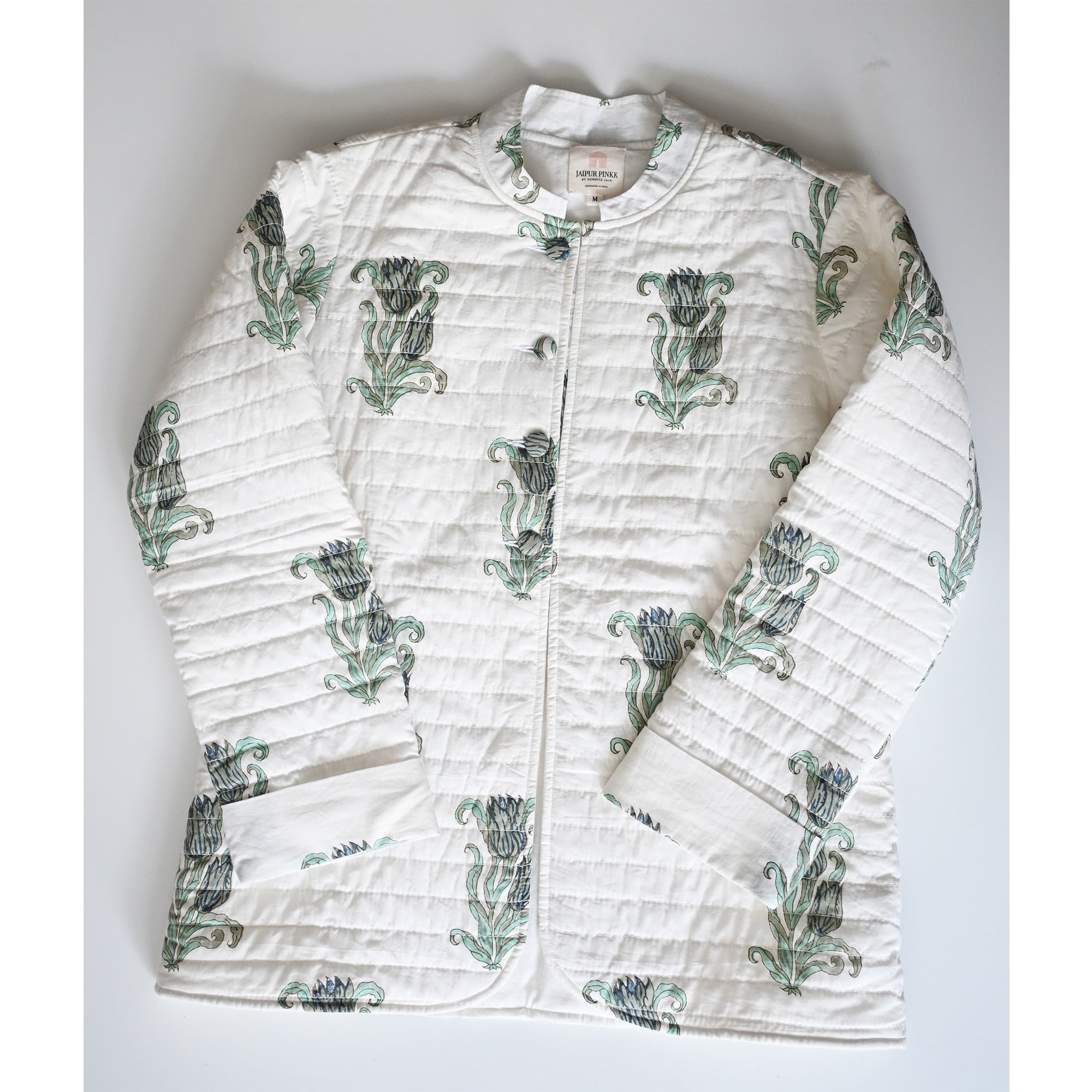 ブロックプリントで花を散りばめたジャケットが、インド、ラジャスターンからやってきました。程よい量のコットンを入れたキルトは、驚くほど軽くてエアリー。