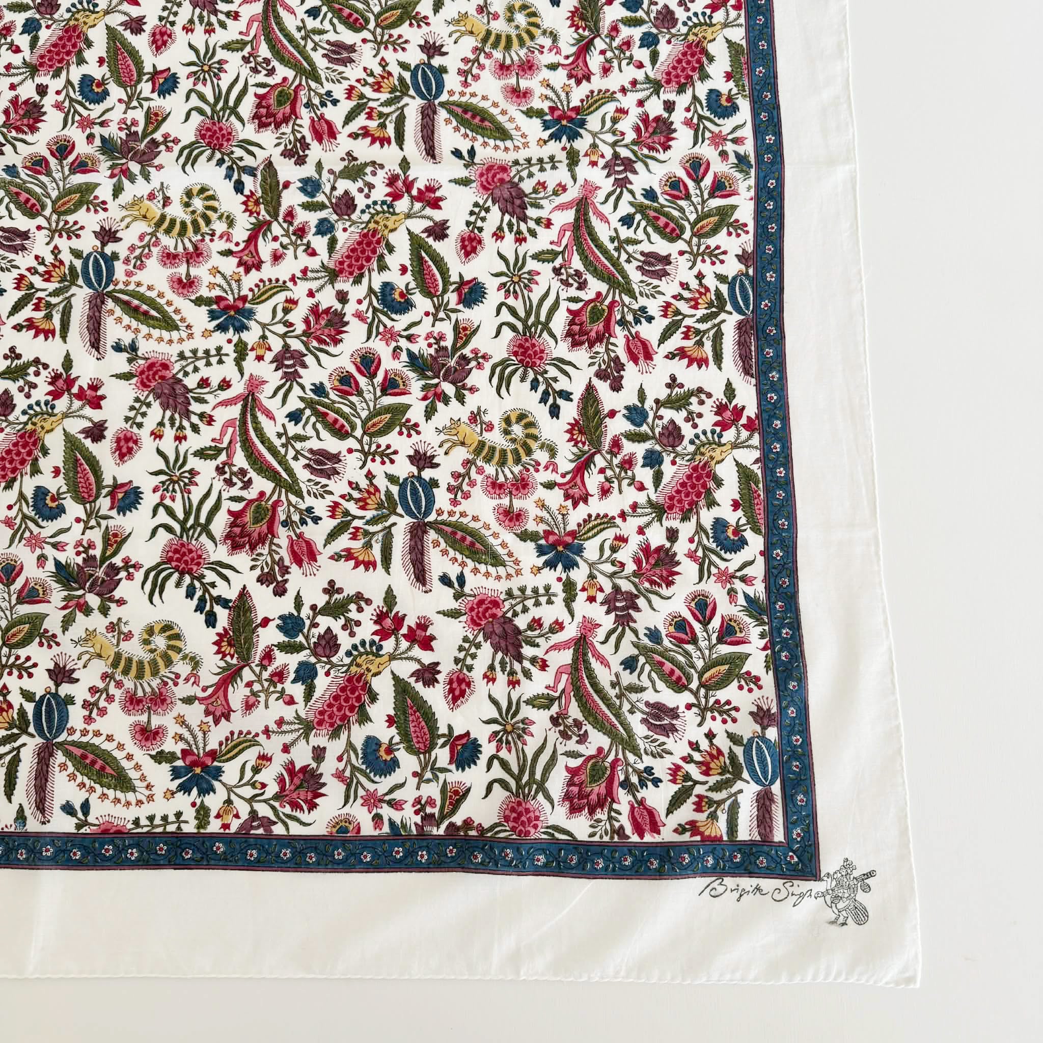 このコクシグル柄は、18世紀にフランスのジュイ=アン=ジョザスの地方で生産された更紗トワル・ド・ジュイの一つとして人気を博したもの。学生時代にインドに渡ったフランス人のブリジットさんがインドのブロックプリントの技術で復刻したモチーフです。鶏、コウノトリ、ツルの要素がミックスされた「Coquecigrues(架空の動物)」から。茶目っ気のある幻想的な絵柄です。